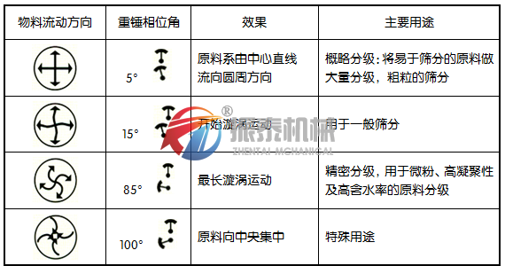 1.相位角為0度的時候,原物料由中心直線流向圓周方向。主要用于概略分級即將易于篩分物料作大量分級粗粒的篩分。